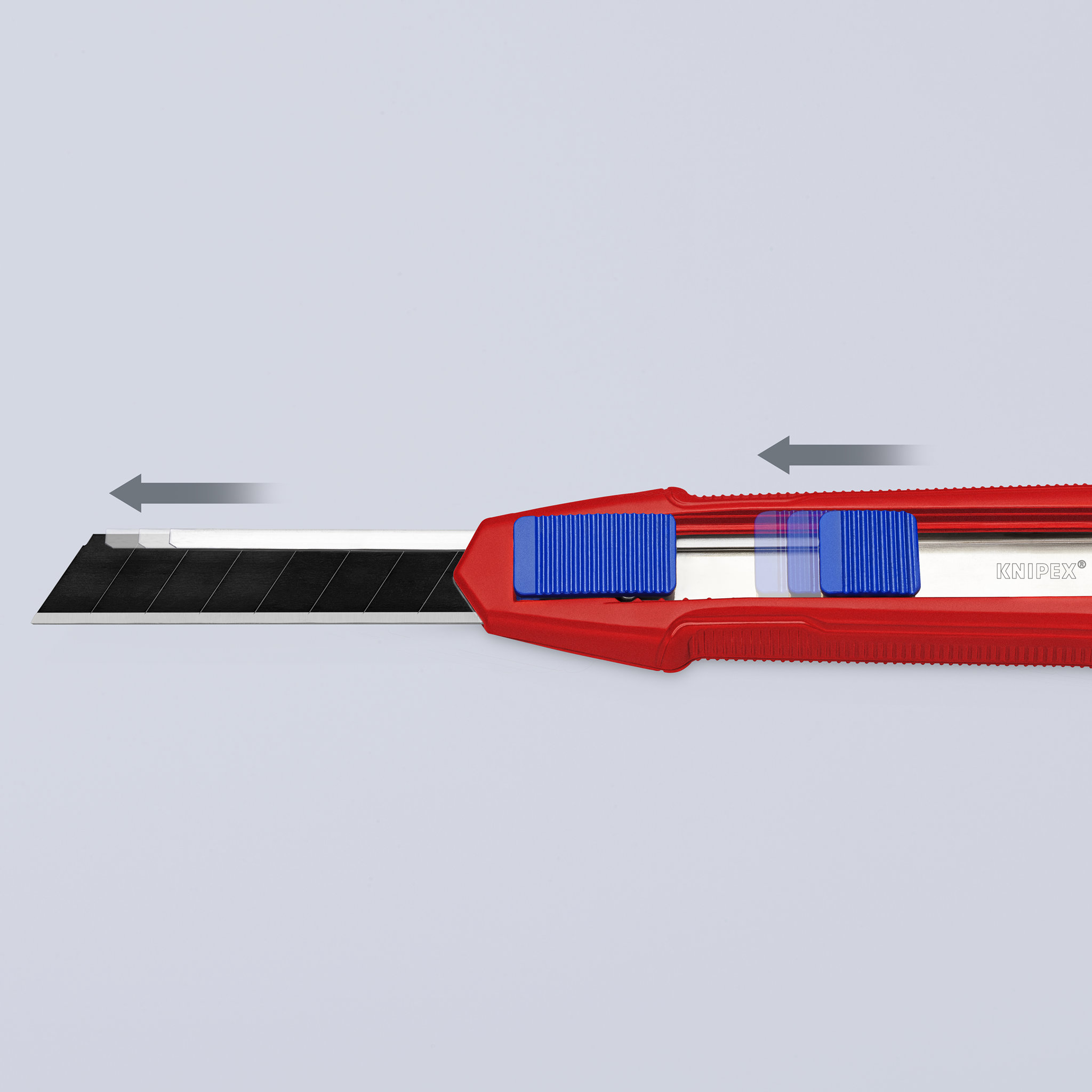 Das KNIPEX CutiX Universalmesser ist ein innovatives, ergonomisches und leichtes Cutter-Messer mit einem Magnesium-Gehäuse, das ca. 111 g wiegt. Die variable Stabilisierungsschiene sorgt für eine stabile Klinge, die bei Bedarf auch biegsam bleibt. Mit der ausgefahrenen Schiene bleibt die Klinge fest, was besonders komfortables Schaben ermöglicht, während sie bei eingefahrener Schiene für präzise Schnitte in engen Ecken flexibel bleibt. Die rutschhemmenden Griffzonen garantieren sicheren Halt, und die Klingenaufnahme sorgt für einen festen Sitz der Abbrechklingen. Das Messer eignet sich für 18 mm hohe Klingen und kommt mit drei hochwertigen Klingen, die werkzeuglos gewechselt werden können.