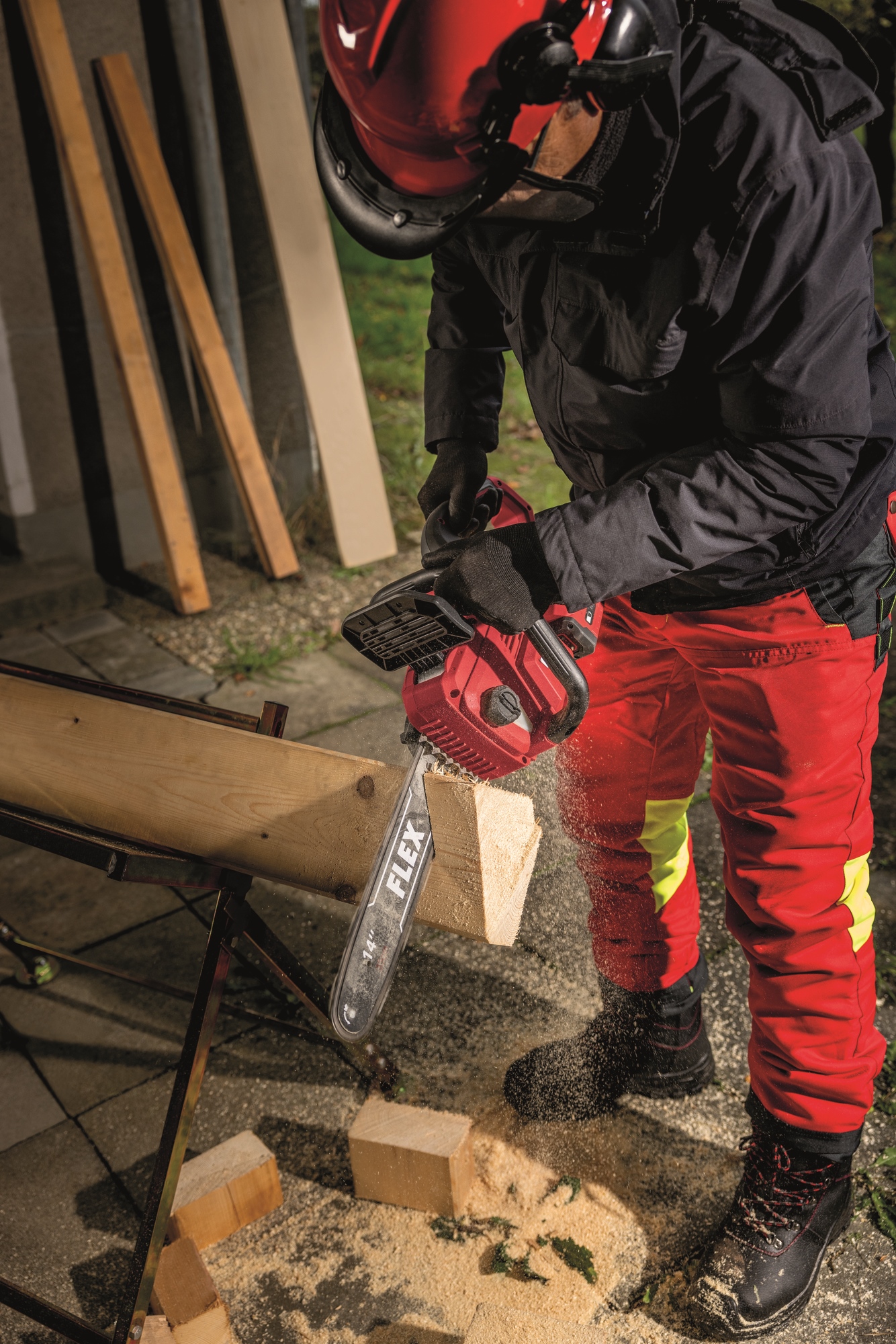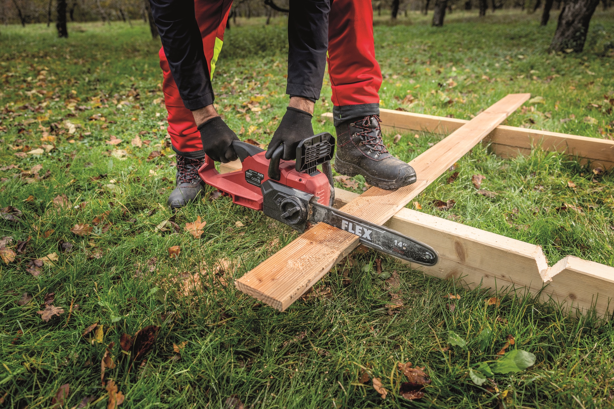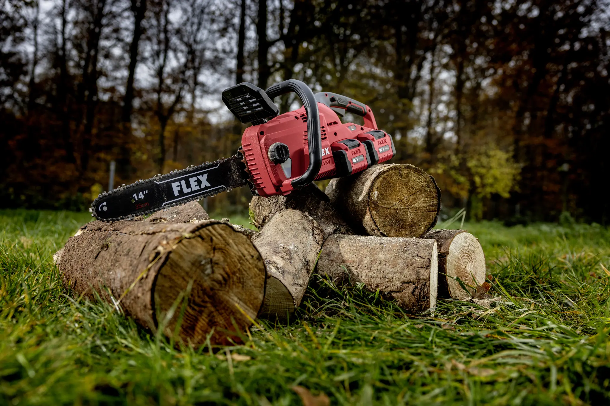 Die 2 x 18V Akku-Kettensäge mit einem 35 cm Schwert ermöglicht schnelle Schnitte in Holz bis etwa 30 cm. Sie verfügt über einen stabilen Krallenanschlag, der die Säge am Holz fixiert, und einen bürstenlosen Motor für höhere Effizienz und längere Lebensdauer. Eine Rückschlagbremse stoppt die Kette in 0,12 Sekunden, während die werkzeuglose Kettenspannung und die automatische Kettenschmierung für eine einfache Handhabung sorgen. Der ergonomische, gummierte Griff bietet Komfort und Sicherheit. Die Geräuschreduzierung macht die Säge ideal für lärmsensible Bereiche. Sie ist mit allen FLEX 18V Akkupacks kompatibel (Akku und Ladegerät nicht enthalten).
