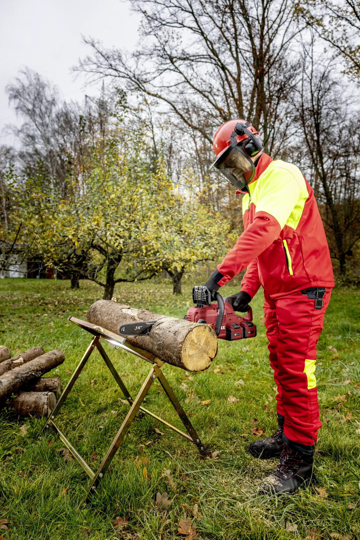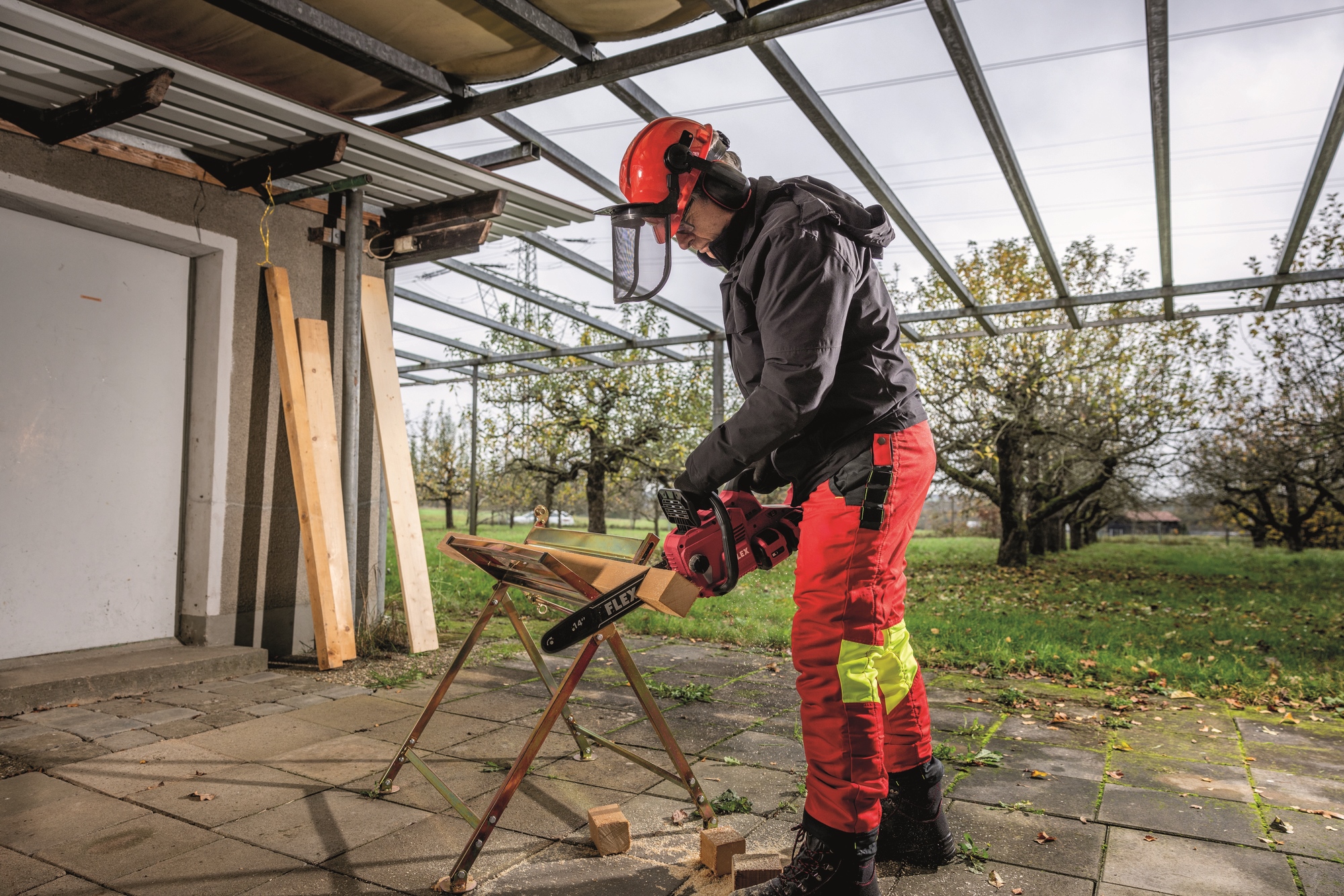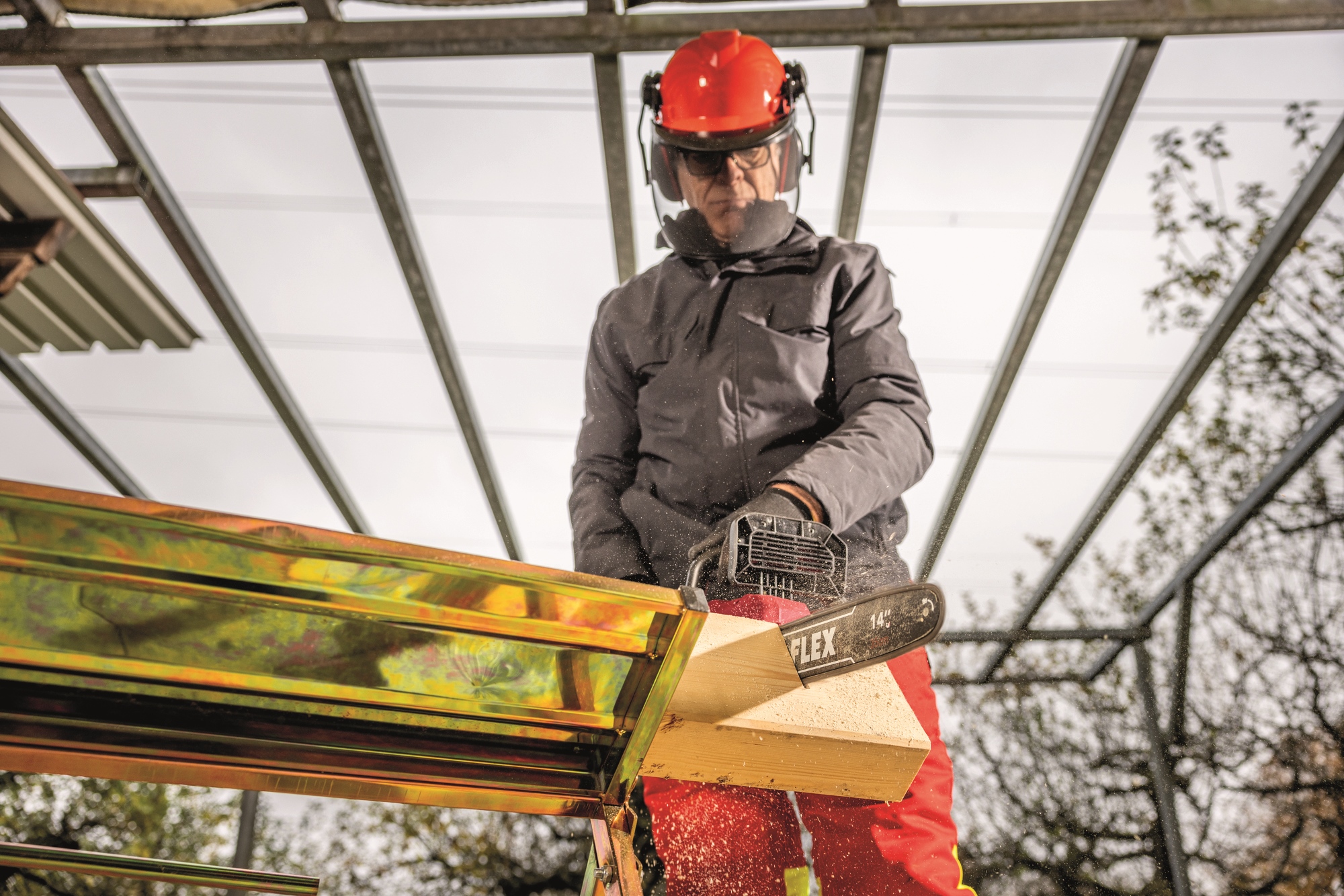 Die 2 x 18V Akku-Kettensäge mit einem 35 cm Schwert ermöglicht schnelle Schnitte in Holz bis etwa 30 cm. Sie verfügt über einen stabilen Krallenanschlag, der die Säge am Holz fixiert, und einen bürstenlosen Motor für höhere Effizienz und längere Lebensdauer. Eine Rückschlagbremse stoppt die Kette in 0,12 Sekunden, während die werkzeuglose Kettenspannung und die automatische Kettenschmierung für eine einfache Handhabung sorgen. Der ergonomische, gummierte Griff bietet Komfort und Sicherheit. Die Geräuschreduzierung macht die Säge ideal für lärmsensible Bereiche. Sie ist mit allen FLEX 18V Akkupacks kompatibel (Akku und Ladegerät nicht enthalten).