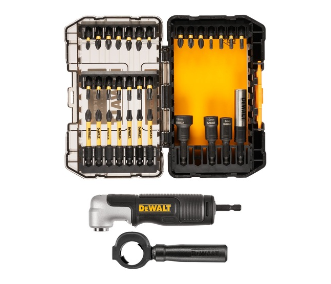 Dieses 33-teilige Set enthält u. a. einen schlagfesten Winkelvorsatz, ideal zum Einsatz bei eingeengten Platzverhältnissen und ist Teil des modularen DEWALT TOUGHCASE Systems und vollständig kompatibel mit allen TOUGHCASE Sets und TSTAK-Aufbewahrung.