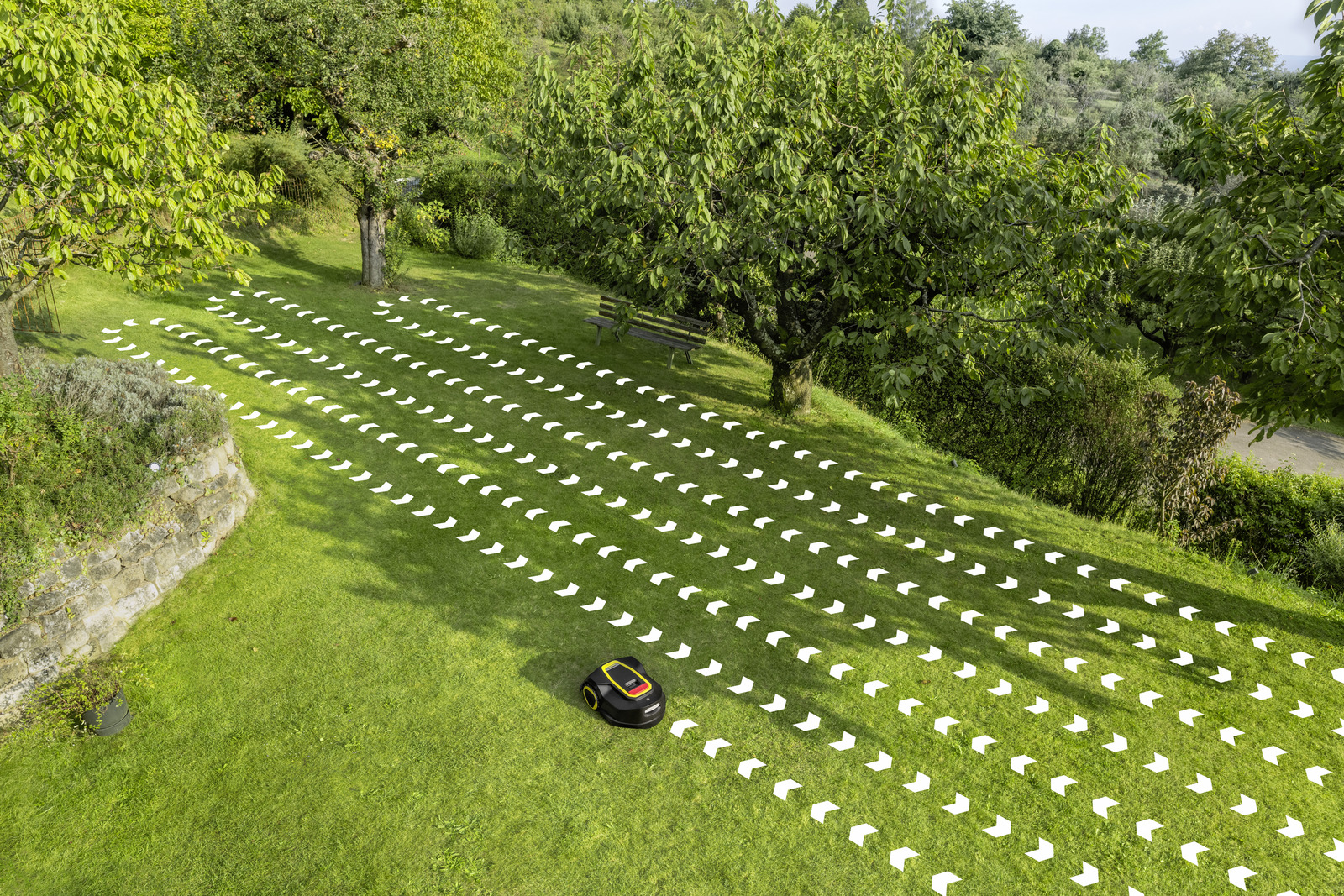 Der Mähroboter arbeitet in parallelen Bahnen für maximale Effizienz. Der Abstand zwischen den Bahnen ist flexibel einstellbar.