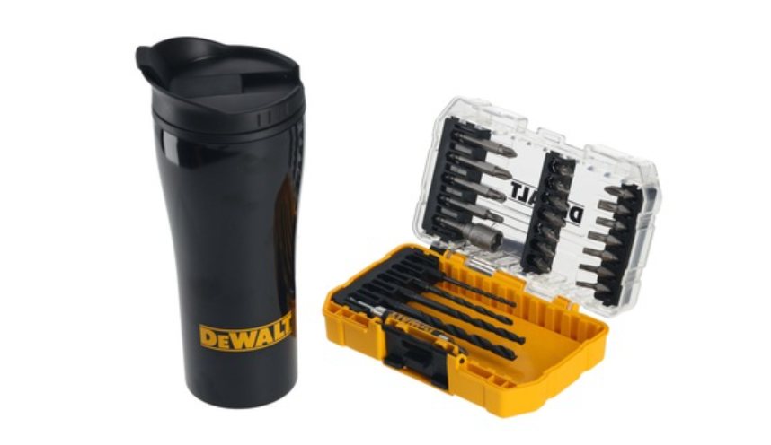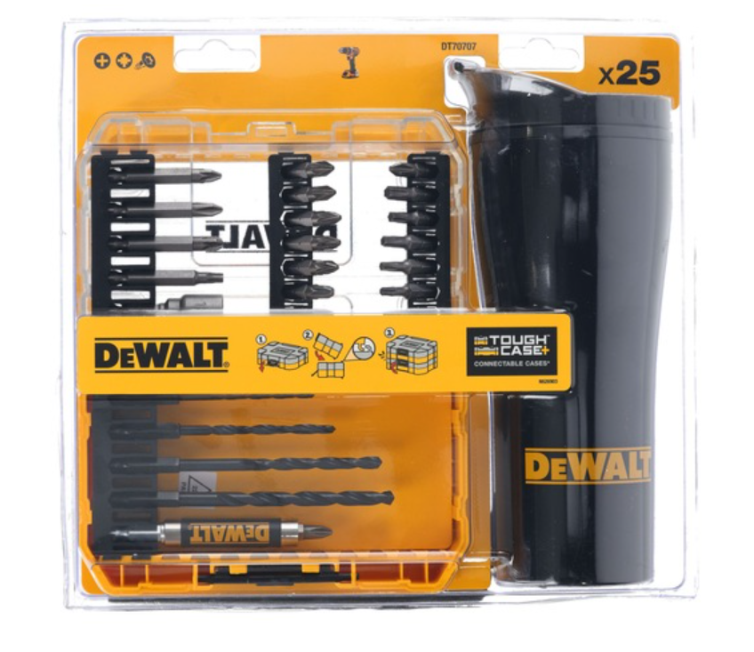 Zum Lieferumfang gehört ein Bithalter mit ausziehbarer Führungshülse, der für zusätzliche Stabilität und bessere Kontrolle beim Eindrehen sorgt. Darüber hinaus enthält das Set einen Steckschlüsseleinsatz sowie eine Auswahl an Metallbohrern mit Sechskantschaft. Ein praktischer Trinkbecher ist ebenfalls im Set enthalten.