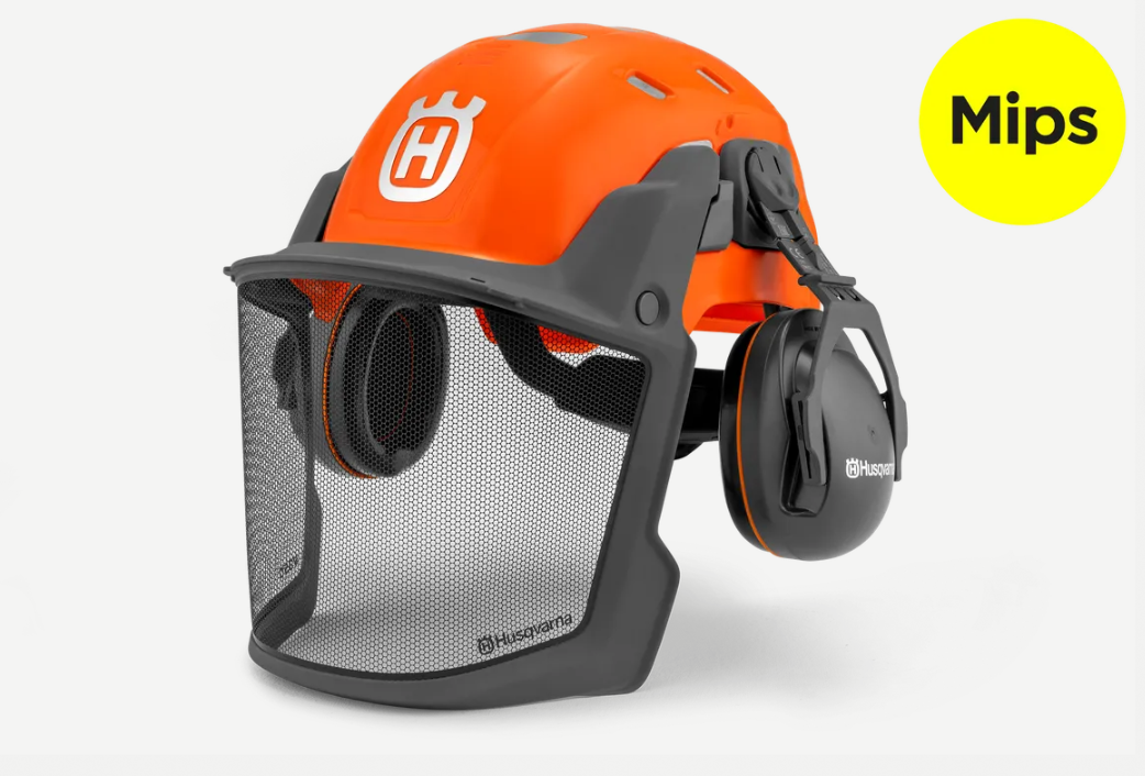 • Technischer Helm von Husqvarna mit Mips®-Sicherheitssystem für Forsthelme. Das Mips®-System ist so konzipiert, dass es Bewegungen am Helm ermöglicht, um die Rotationsbewegung bei bestimmten Aufprallwinkeln vom Kopf weg zu leiten.