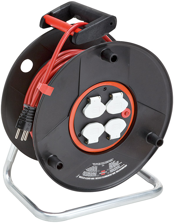 Kabelrolle aus Stahl 33mx1.5mm. Die Robuste! Qualitätskabelrolle aus Vollmetall, mit 3x1,5 mm quadrat Kabel in 33 Meter Länge.