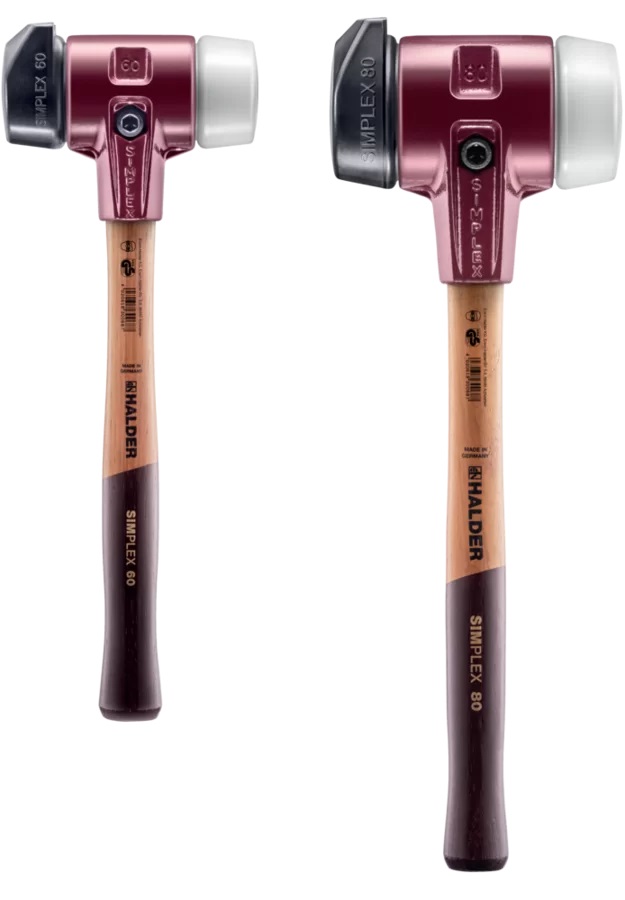 Die SIMPLEX-Schonhämmer D60mm und D80mm mit Gummikomposition- und Superplastik-Einsätzen sind vielseitige Werkzeuge. Der Gummi-Einsatz mit Standfuss ermöglicht ergonomisches Arbeiten, da er den Hammer sicher abstützt und das Bücken reduziert. Der Einsatz ist verschleissarm, dämpfend und geruchsneutral. Der Superplastik-Einsatz bietet höhere Schlagkraft und ist besonders widerstandsfähig. Das Temperguss-Gehäuse mit integrierter Stielschutzhülse sorgt für hohe Bruchsicherheit. Der ergonomische, schwingungsdämpfende Holzstiel ist doppelt lackiert und schmutzunempfindlich. Alle Teile sind austauschbar und nachrüstbar, was sowohl wirtschaftlich als auch ressourcenschonend ist. Erhältlich in D60mm und D80mm, auch mit kurzem Stiel oder als Vorschlaghammer mit langem Stiel